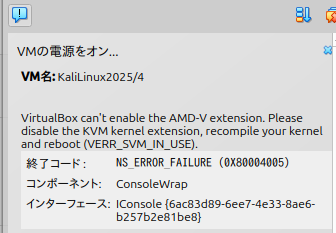VirtualBoxが起動できない。→仮想化支援機能がKVMと競合。KVMモジュールを一時的に停止して解決。