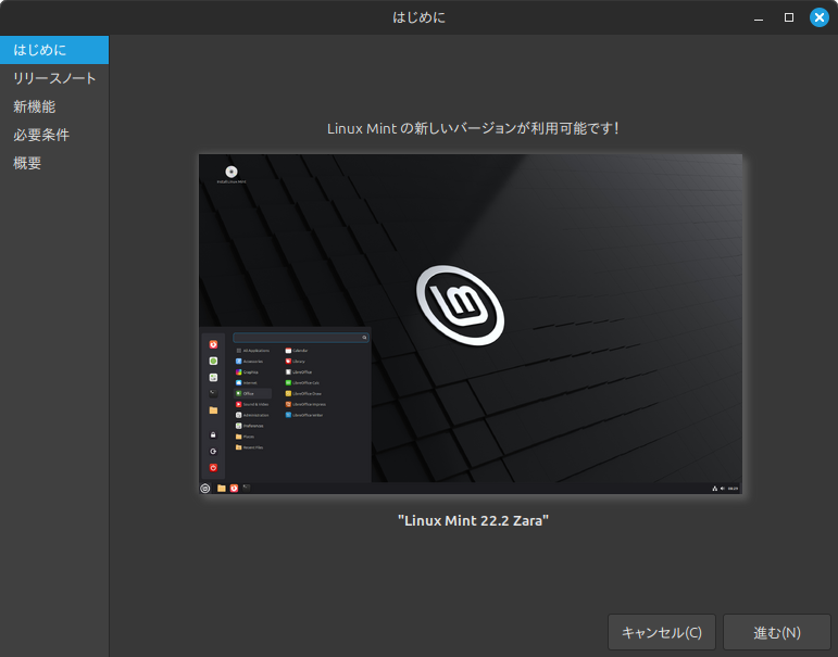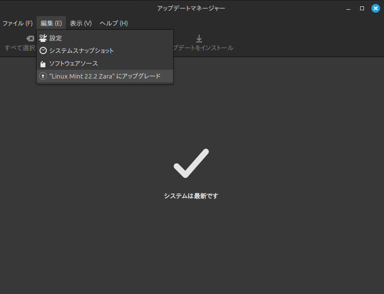 再び起動したら、改めてアップデートマネージャーを起動して、「編集」>「”Linux Mint 22.2 Zara”にアップグレード」を選択します。