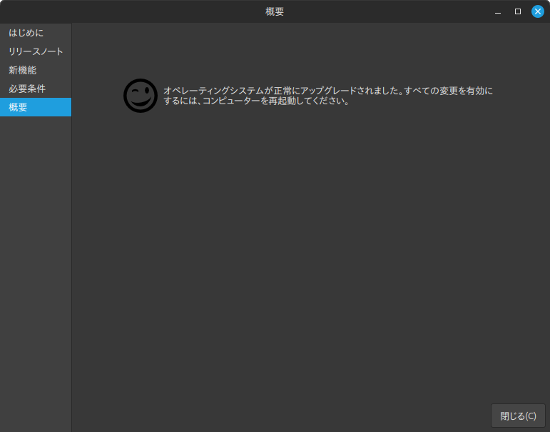 「リスクを理解して”Linux Mint 22.2 Zara”にアップグレードします。」にチェックを入れて「適用(A)」をクリック。後は自動的にダウンロード&インストールが実行されます。