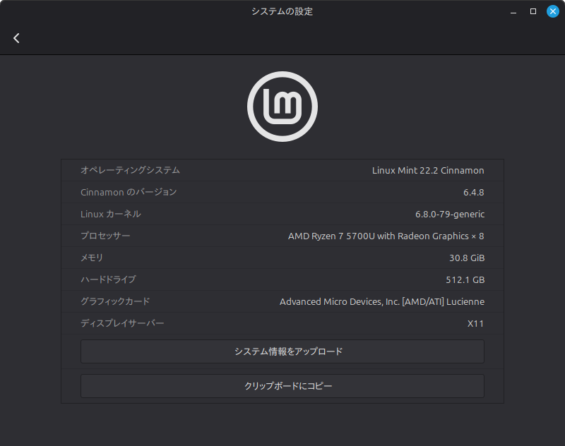 再起動後に「設定」>「システム情報」を開くと22.2へアップグレードされていることを確認できます。