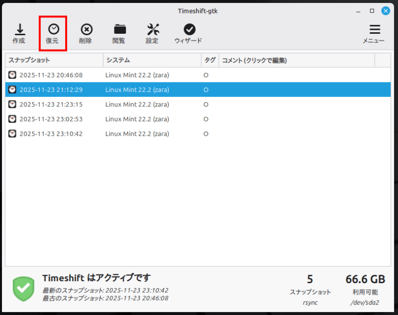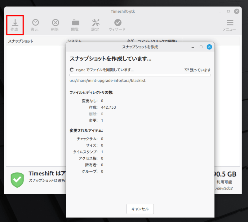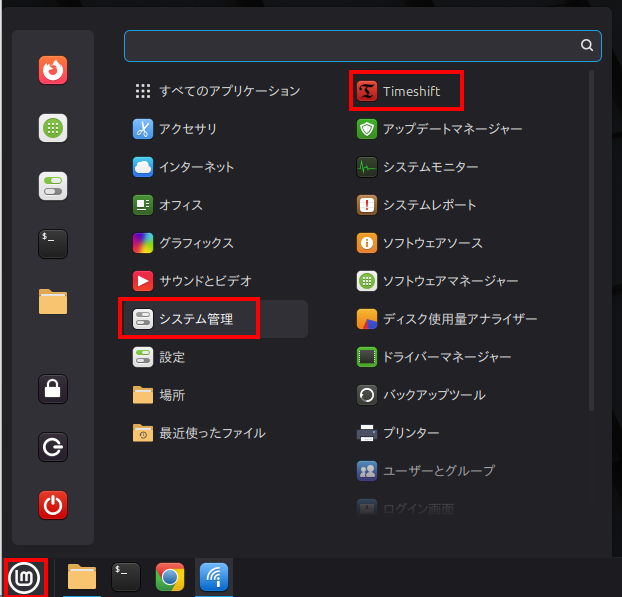 起動: メニュー>システム管理>Timeshiftを起動します。(パスワードを求められます)。