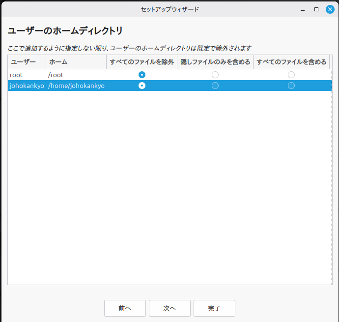 ユーザーのホームディレクトリ内のファイルも一緒にバックアップしたい場合「すべてのファイルを含める」にチェックを入れたいところですがオススメしません。個人データを含めると復元時にデータが先祖返りして消えてしまうリスクがあるため、TimeShiftでは除外するのが鉄則です。