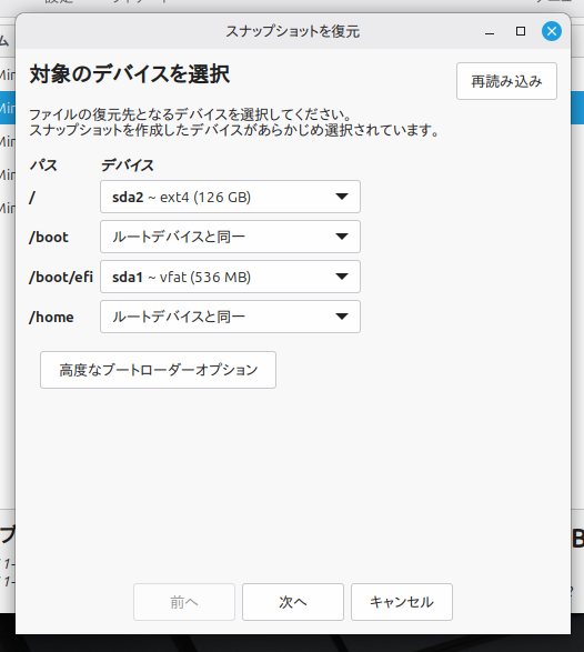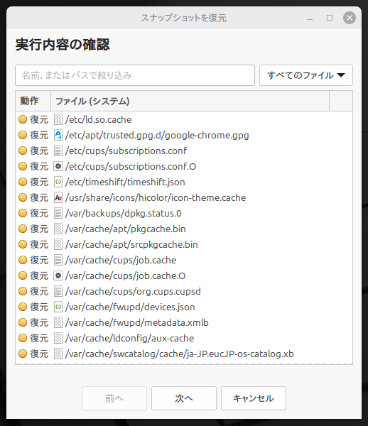 そんなときに備えてLinuxMintに標準で搭載されているTimeShiftを利用しておくと安心です。調子が良かった時の状態に”巻き戻して”くれます。