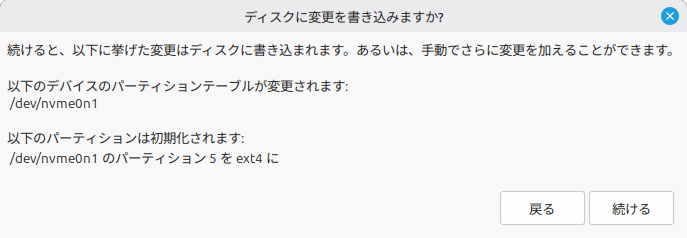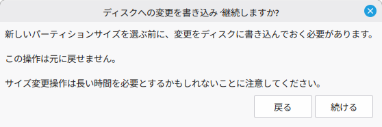ここで「続ける」をクリックすると、デュアルブート化の作業が進行します。思いとどまるなら「戻る」をクリックします。