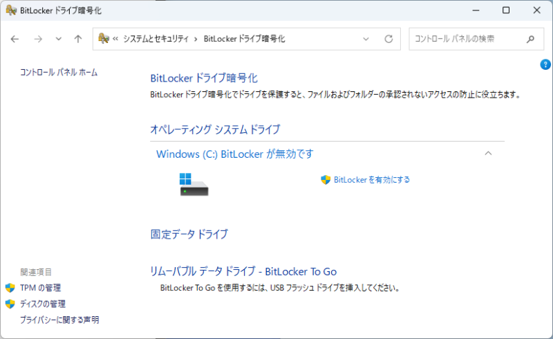Windowsの「コントロールパネル」を開いてBitLockerを一時的に無効にしておきます。