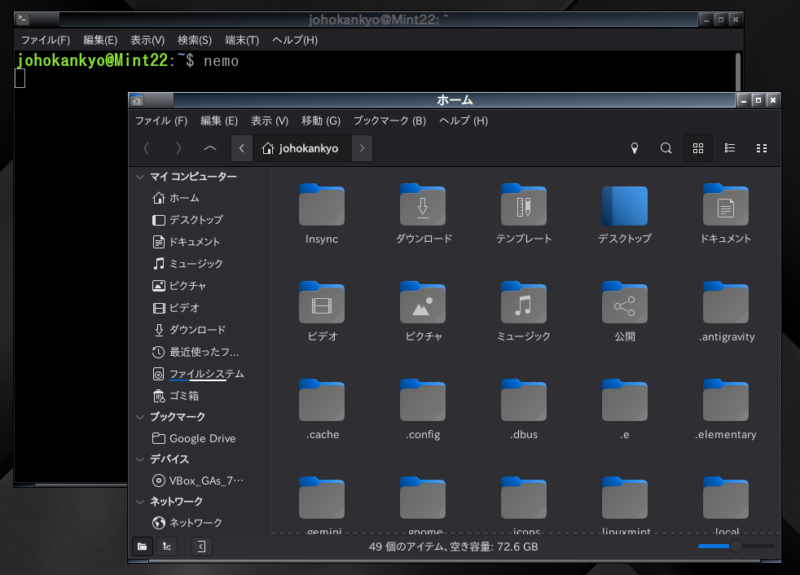 Linux Mint Cinnamonエディションの場合、ファイルブラウザーは「nemo」