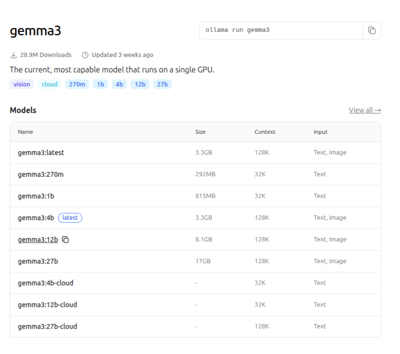 - 使いたいサイズのタグ(下記の例ではgemma3:12b)の右にあるコピーボタンを押します。