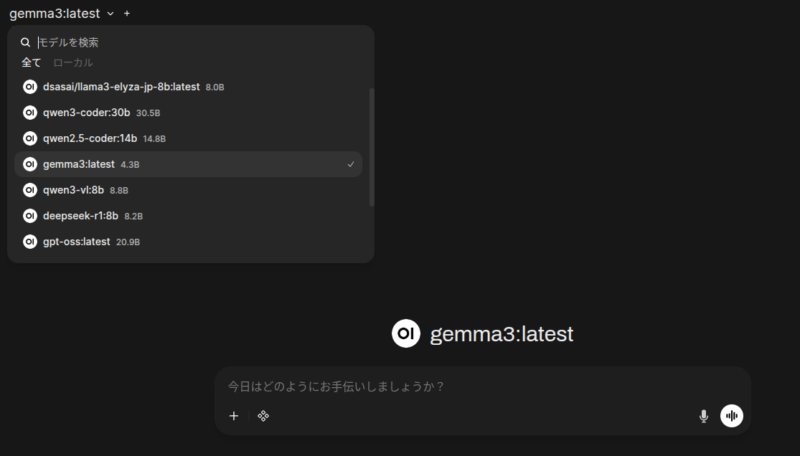ダウンロードが始まり、完了したら画面上部のモデル名表示部分をクリックしてモデルを切り替えます。