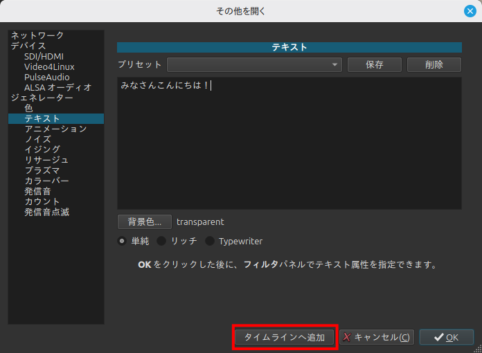 「テキスト」を選択すると、テキスト入力画面が現れるのでテロップにしたい文字を入力して「タイムラインへ追加」をクリック。