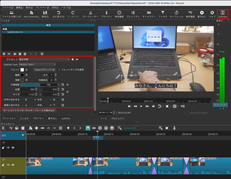 すると自動で映像トラックが追加され、文字が映像の上に表示されます。文字の大きさ、色、配置などを好みで変更します。