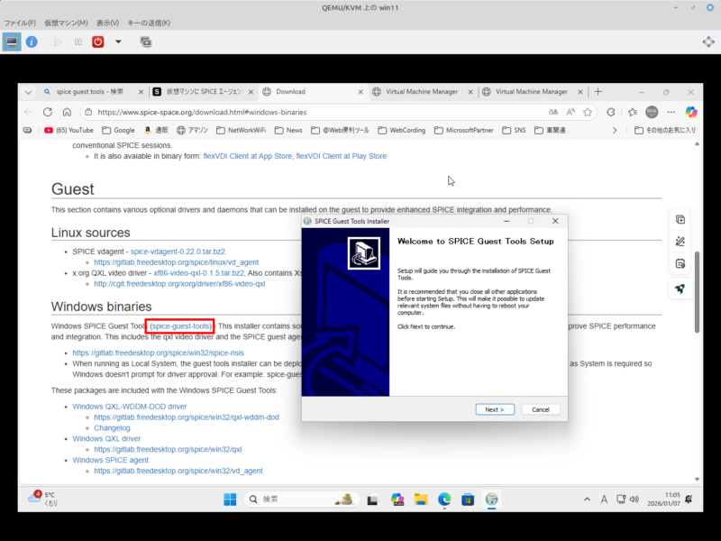- ツールのダウンロード: 仮想マシン内のブラウザから spice-guest-tools-latest.exe をダウンロードします。