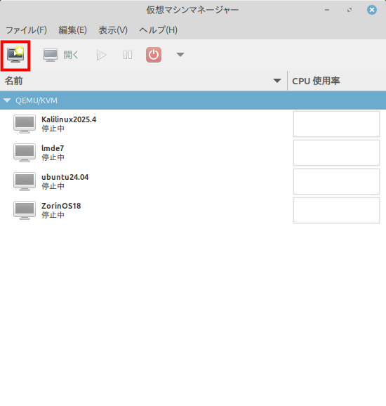 新しいマシンを作る: 左上の「新しい仮想マシンを作成(モニターに星が付いたアイコン)」をクリックします。