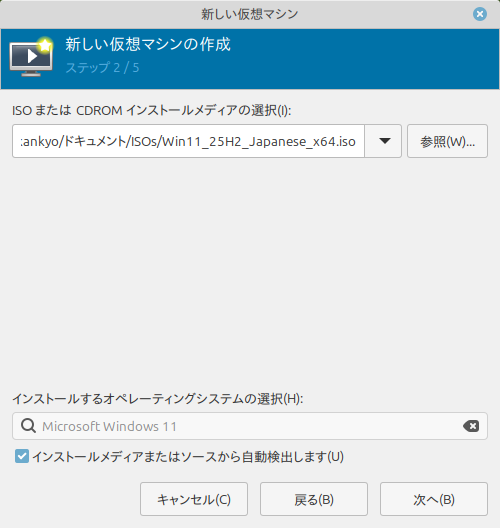 ISOを選定:「ローカルのインストールメディア」を選択します。