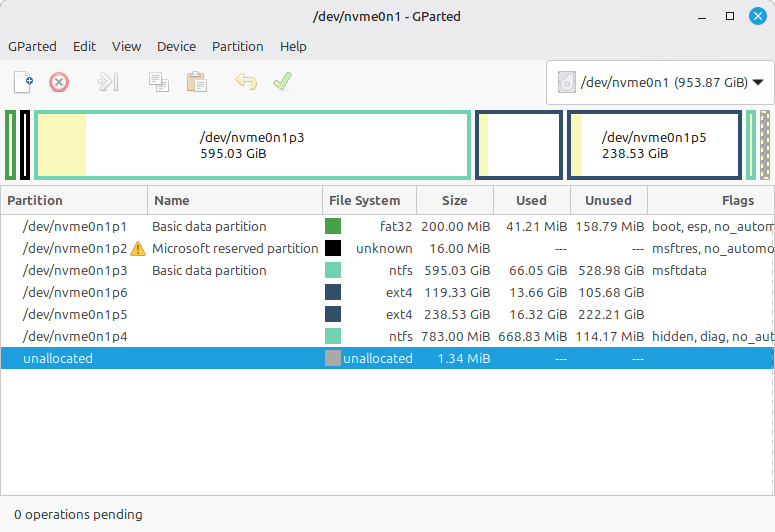 GPartedが起動すると、現在のディスクの使用状況が色分けされたバーで表示されます。
