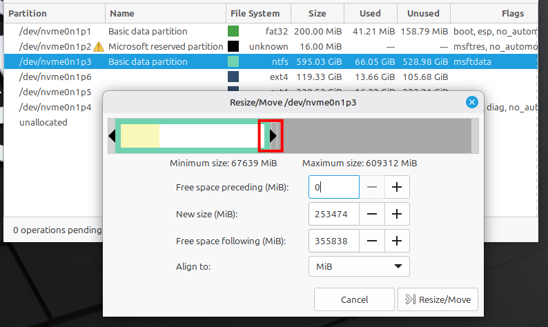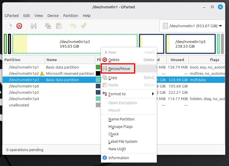緑色の枠で表示されているWindowsのパーティション(ntfs)を右クリックし、「Resize/Move」を選択します。