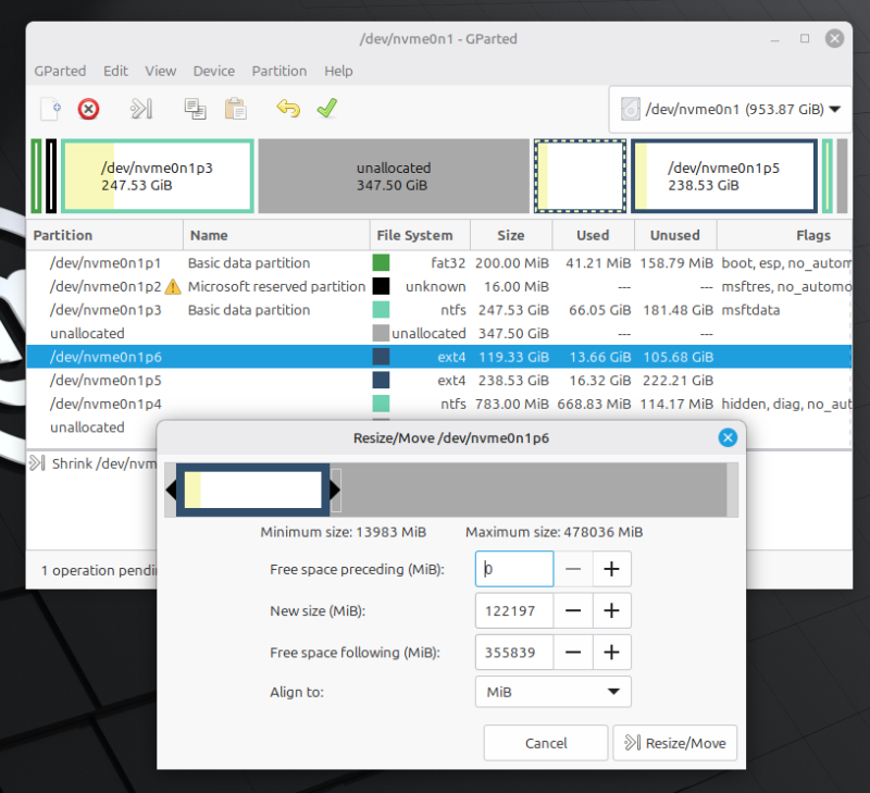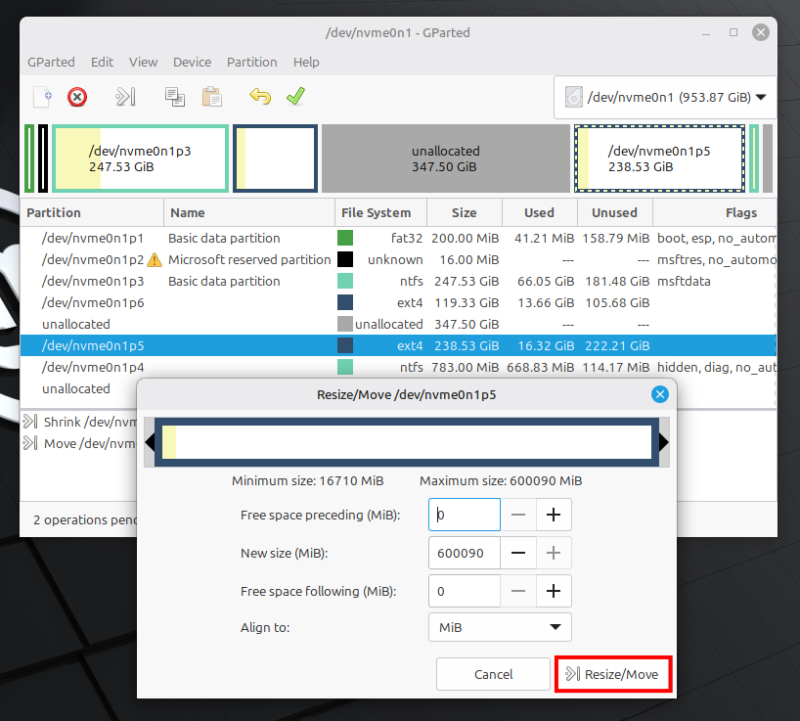 - 以上によって隣り合ったLinux Mintのパーティション(ext4:238.53GiB)を右クリックし、「Resize/Move」を選択します。