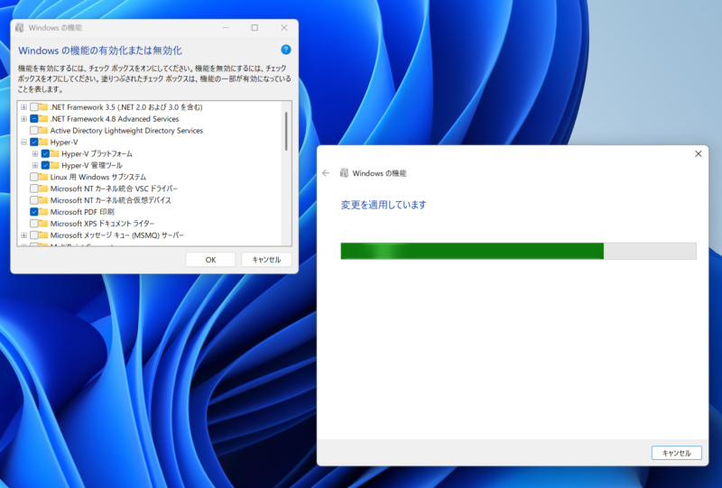 Windowsの検索窓に「Windowsの機能の有効化または無効化」と入力し、Hyper-Vにチェックを入れると機能の追加作業をが自動で行われます。完了したらいったん再起動します。