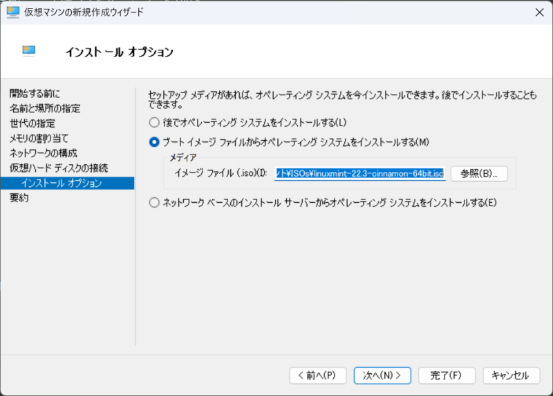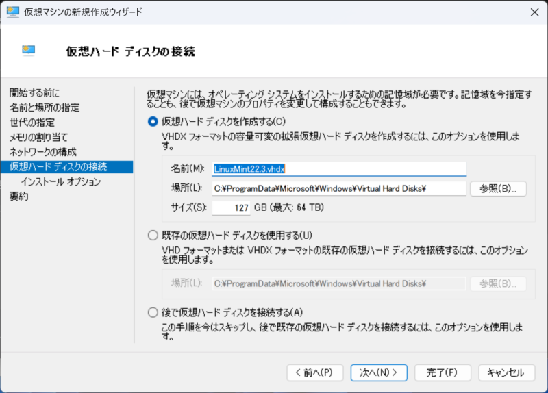 名前と場所: 「LinuxMint22.3」など好きな名前を付けます。