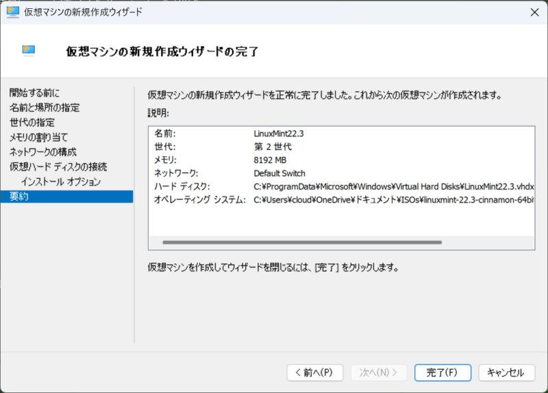 仮想マシンの新規作成ウィザードの完了
