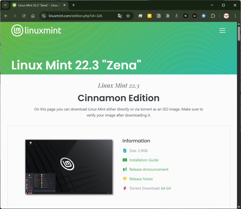 Linux Mint公式サイトから、ISOファイルをダウンロードします。
