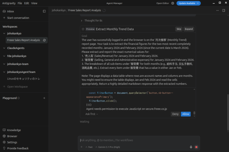 Antigravityの「ブラウザサブエージェント」を使えば、人間に代わってfreeeの画面を操作してくれます。