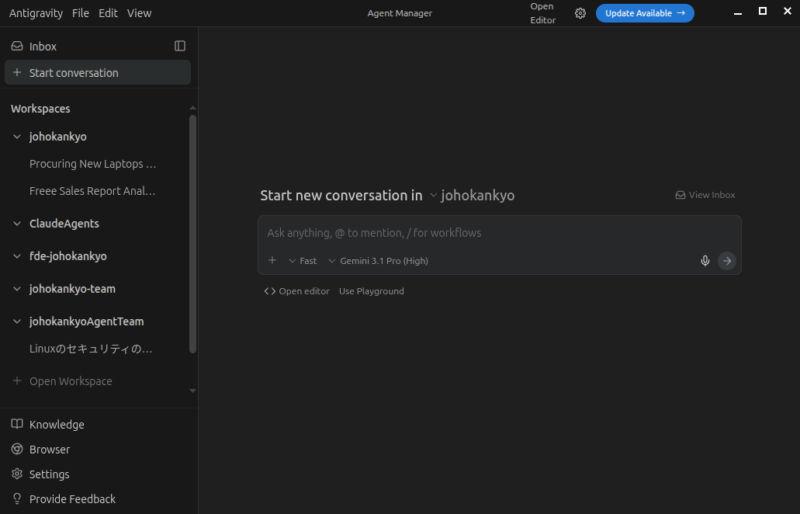 | Agent Manager | エージェントへの依頼・管理 | 「Start new Conversation」からタスクを投げ、AIに「丸投げ」する場所 |