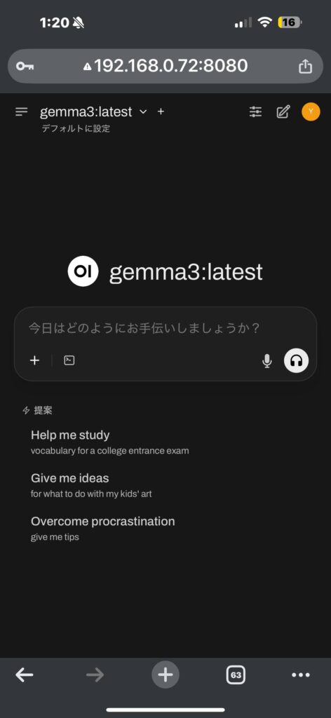 今回の例の場合、このアドレスに「:8080」をつけて、他のデバイスのWebブラウザーで”192.168.0.72:8080”とすることで、他の機器からアクセスしてローカルAIを利用することができます。