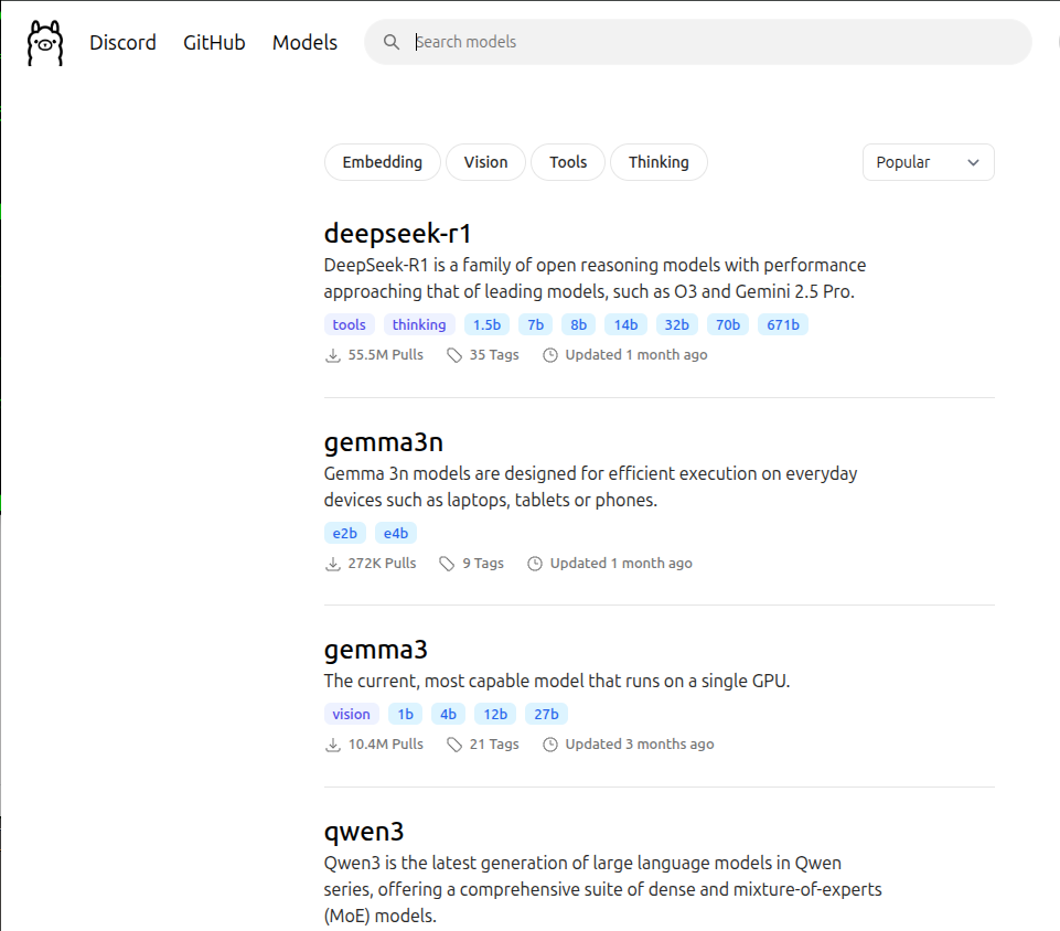 ollamaの公式ページから数多くのAIモデルを入手して利用できます。https://ollama.com/search