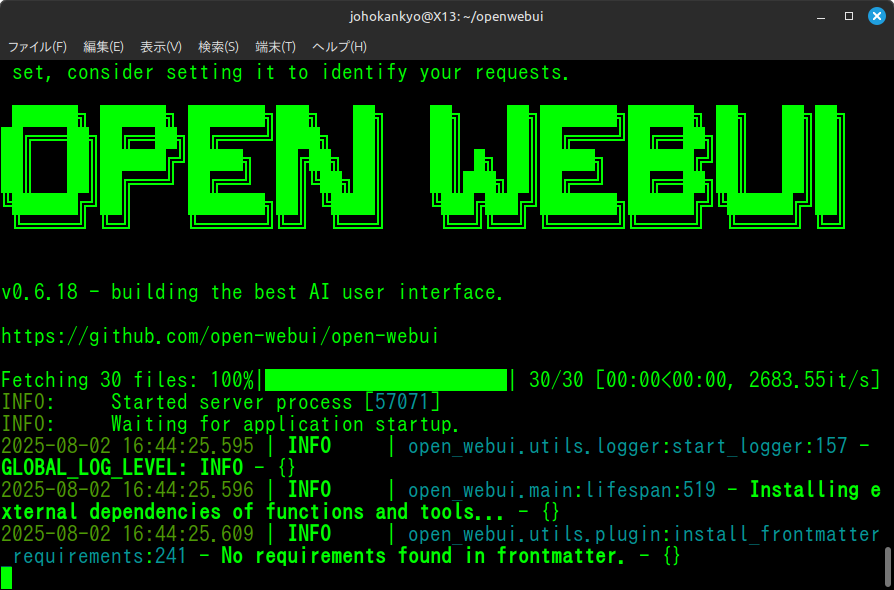 インストールが完了したら、仮想環境がアクティブな状態で以下のコマンドを実行してOpen WebUIを起動します。