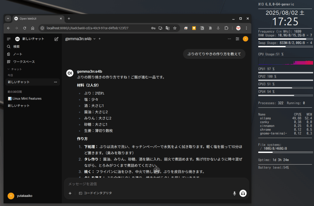 gemma3 n:e4bの場合、回答が生成されるまでに時間はかかりますが、実用に耐えられるレベルです。