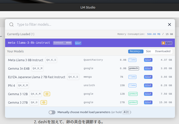ダウンロード済みのモデルが一覧で表示されるので、利用したいモデルをクリックして選択してロードさせます。