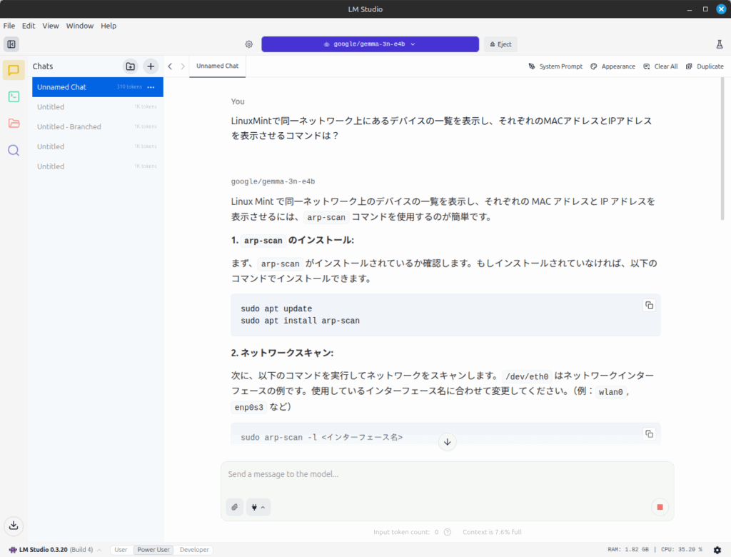 - モデルの読み込みが完了すると、中央にチャット画面が表示されます。下部の入力欄に「こんにちは!」や「LinuxMintの便利な使い方を教えて」など、自由にメッセージを入力してEnterキーを押してみてください。