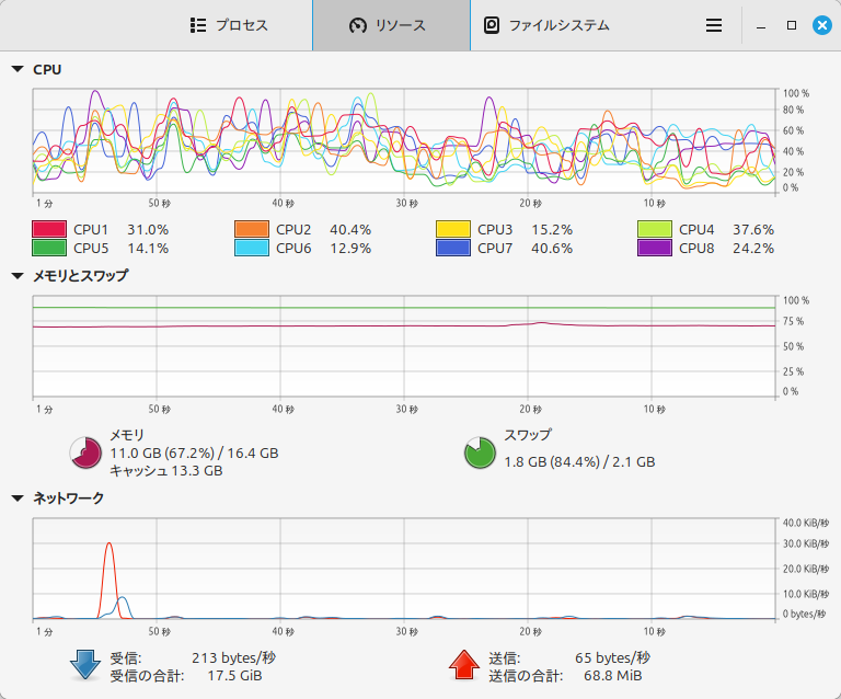 メモリーの使用状況は「システムモニター」アプリで確認することができます。